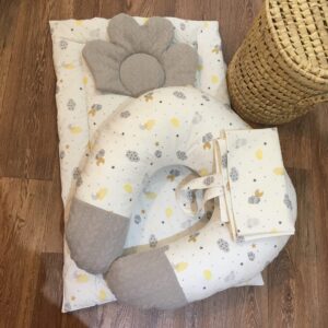 365.00 د.م.Ensemble pratique pour le confort de bébé et de maman, comprenant un Kouna, un tablier d’allaitement et un coussin d’allaitement.